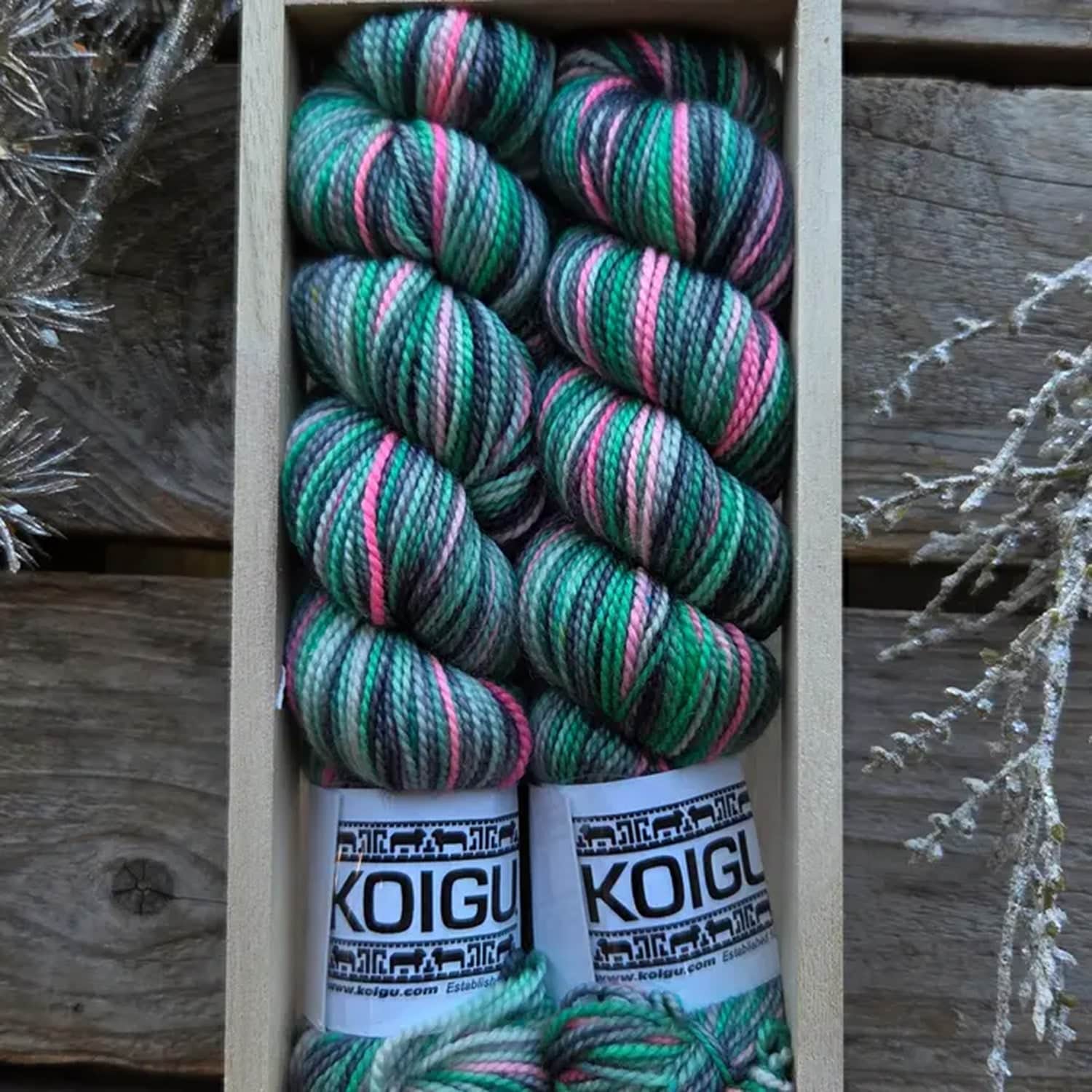2 x 50g KPPPM skeins in an adorable wooden crate.